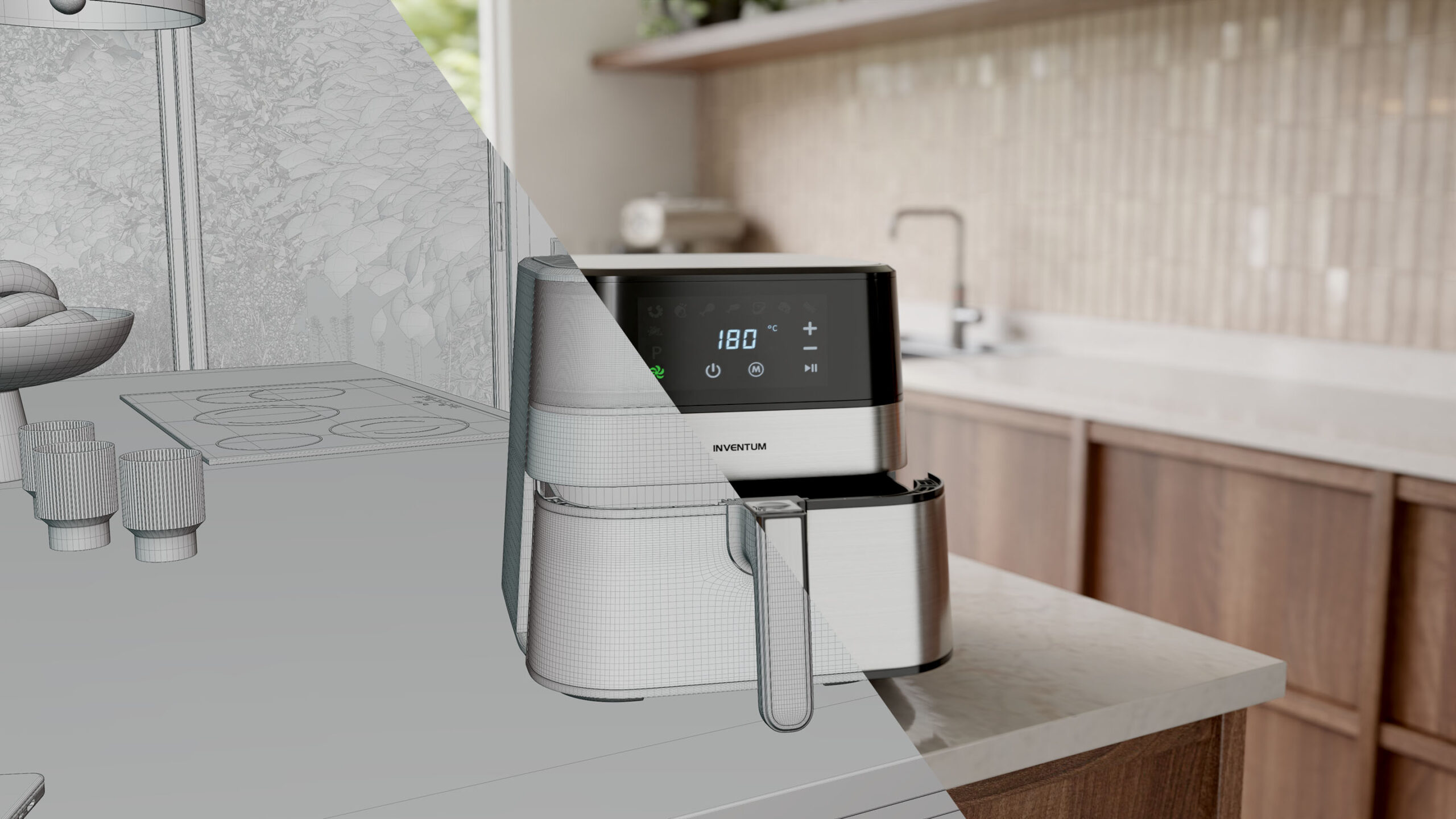 In opracht van Hippo Creative Studio’s heb ik een Inventum airfryer volledig in 3D gemodeld, belicht en gerenderd binnen een realistische keukenomgeving. Het doel was om een productvisualisatie te creëren die zowel technisch nauwkeurig als visueel aantrekkelijk is. .
