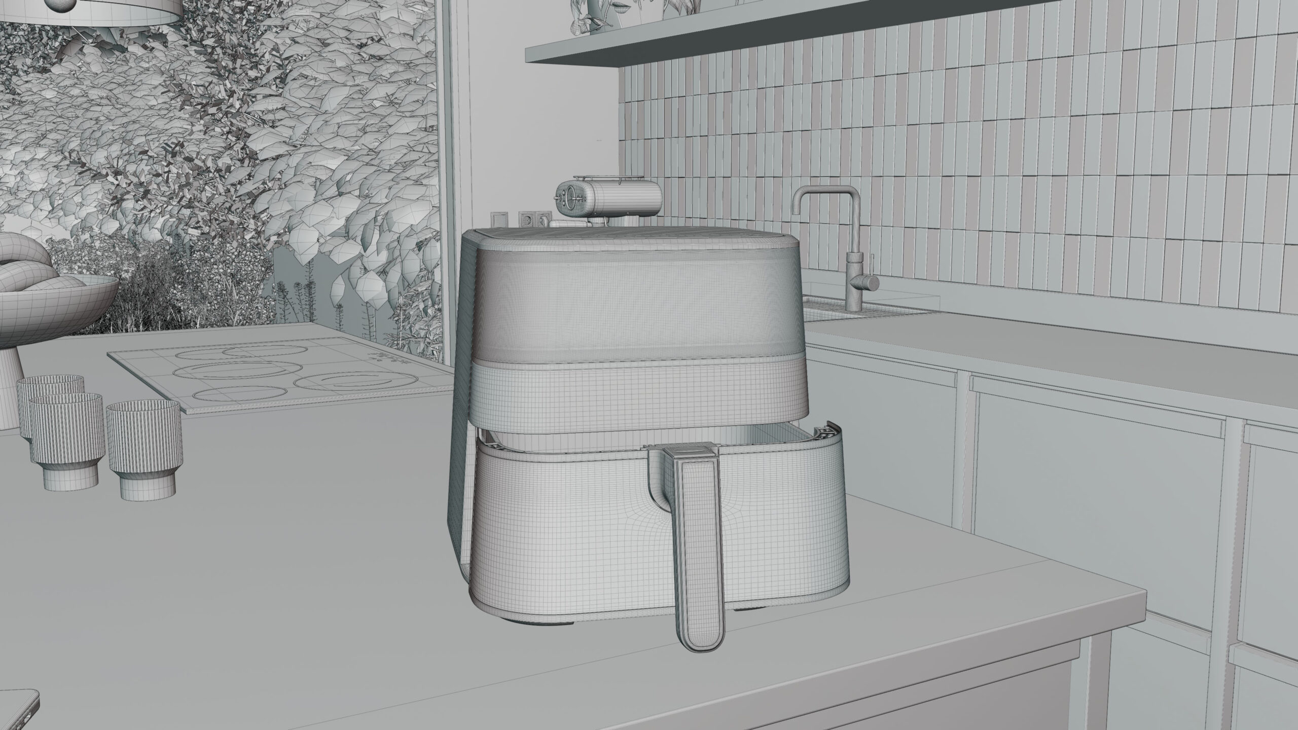 Bij het modelleren van de airfryer heb ik zowel live referenties als digitale productfoto’s gebruikt om de verhoudingen en details zo nauwkeurig mogelijk vast te leggen. Na het modelleren heb ik de airfryer in een keuken opstelling geplaatst om het product in een herkenbare omgeving te laten zien. Vervolgens een realische belichtingsopstelling gemaakt en dit gerenderd in video en stills. Dit zorgde voor een overtuigende presentatie waarin zowel de functionaliteit als de uitstraling van de airfryer mooi naar voren komen.
